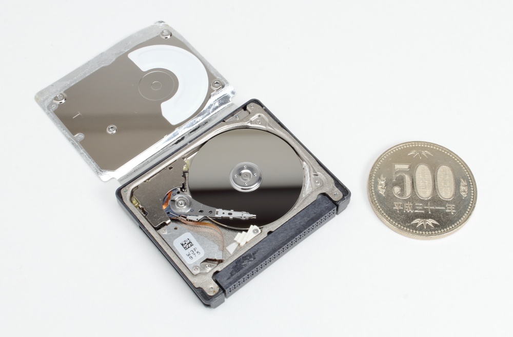 プラッターは、ほぼ500円玉サイズとなる1インチ。HDD技術の向上で、CFサイズのままでも容量をアップしていけるというのも利点でした。事実、最初は340MBで登場しましたが、1年ちょっと後には1GBが登場し、最終的に8GBまで強化されました。